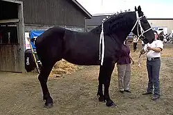 Les standards du Frison[20], du Mérens[21],[15] et du Minorquin[22] n'acceptent que des individus noirs, ces trois races étant réputées pour leur sélection sur la couleur de robe. C'était aussi le cas du cheval de trait Nivernais, sélectionné exclusivement sur la couleur noire avant sa fusion dans le stud-book du Percheron[23].