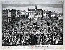 Le , la sentence est exécutée, dans des conditions particulièrement atroces. Il s'agit, selon Louis-Sébastien Mercier, du « supplice le plus horrible & le plus dégoûtant que la justice ait jamais osé imaginer, pour venger les rois[11] ». Les seize bourreaux venus de toute la France, sans réelle pratique de ce genre de torture, attachent quatre chevaux rétifs conduits par des cavaliers enivrés, probablement pour les besoins de la cause. Une foule immense assiste à ce spectacle ; les balcons des maisons de la place de Grève sont loués jusqu'à 100 livres (un homme se serait défenestré par accident, tuant deux personnes en tombant). Alors que des femmes du grand monde croient se faire bien voir du roi en trouvant plaisant le spectacle, la foule gronde car les exécuteurs, horrifiés, ne réussissent leur besogne qu'au bout de soixante reprises[8]. En effet, l'homme est de constitution extrêmement robuste, et le supplice dure deux heures et quart, les bourreaux ayant l'interdiction des juges de couper d'abord les tendons des membres pour faciliter l'arrachement ; ils finissent toutefois par en obtenir l'autorisation, après consultation des médecins, et comme le jour s'achève[12]. La mort de Damiens survient seulement à la tombée de la nuit, à l'arrachage du bras droit, le dernier membre. Une image qui hantera le jeune bourreau Charles-Henri Sanson, alors tout juste âgé de dix-huit ans[13] ; chargé d'assister son oncle Nicolas-Charles-Gabriel Sanson, il ne peut s'acquitter de cette tâche jusqu'au bout (tandis que son oncle cesse définitivement son activité à l'issue de cette exécution).