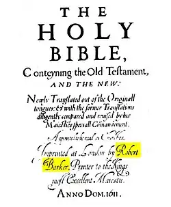 En 1611, Robert Barker imprime la première édition de la Bible du roi Jacques (King James Version en anglais). Bien qu'elle soit appelée "version autorisée", elle n'a pas été officiellement "autorisée" par le roi, quoique celui-ci se soit personnellement intéressé à ce travail qu'il a commandité. Les frais d'impression sont entièrement pris en charge par Robert Barker qui ne retire finalement que peu de bénéfice financier de cette affaire mais qui lui procure une certaine renommée. L'impression elle-même est d'assez mauvaise qualité, avec des lignes d'impression inégales, une police de caractères gothique de mauvaise qualité[réf. nécessaire] et de nombreuses erreurs qui sont corrigées dans les éditions ultérieures.