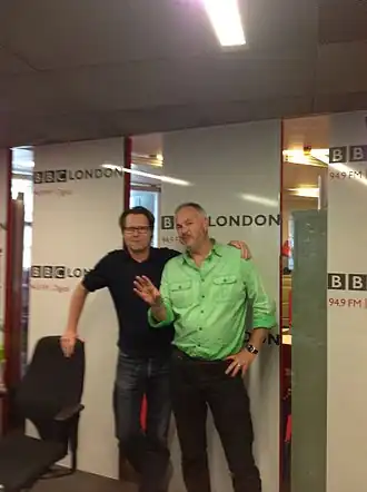 Robert Elms (en noir à gauche, avec lunettes) avec le journaliste Tim Marshall (en) dans les studios de la BBC en 2014.