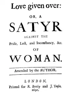 Robert Gould changea d’employeur en 1683 et se fit un nom en écrivant le sulfureux Love Given O'er: Or a Satyr on the Inconstancy of Woman (L’Amour conjuré, ou Satire sur la Femme). Inspiré d'une satire de Juvénal beaucoup plus modérée, le poème de Gould ambitionne de condamner « l'orgueil, la lascivité et l'inconstance de la Femme » et contient un nombre invraisemblable d'invectives très explicites visant la gent féminine. La misogynie exprimée par l'œuvre est l'une des plus dures et des plus viscérales de toute la poésie anglaise. Toutes les éditions du poème ont été très rapidement épuisées en raison de l'enthousiasme des lecteurs.
