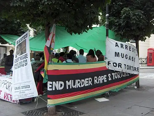 En , un rassemblement de l'opposition tente de manifester contre l'interdiction des manifestations et des rassemblements politiques, contre l'intention du président Robert Mugabe de se présenter à un nouveau mandat en 2008 et pour dénoncer la crise sociale, économique et politique que connaît le Zimbabwe depuis l'an 2000. La police arrête 50 militants (dont le chef de file du MDC, Morgan Tsvangirai) et les passe sévèrement à tabac. Une militante du MDC est tuée par balles. À cette époque, il affirme qu’il est « diplômé en violence »[99].