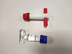 Les robinets d'arrêt font souvent partie de la verrerie de laboratoire, comme les burettes, les ampoules à décanter, les fioles de Schlenk et les colonnes utilisées en chromatographie. Le robinet d'arrêt est un bouchon ou un rotor lisse tamisé avec une poignée, qui s'insère dans un joint femelle correspondant en verre rodé. Le joint femelle fixe est conçu de manière à joindre deux ou plusieurs morceaux de tubes en verre. Le robinet d'arrêt est percé de trous qui permettent de connecter ou de séparer les tubes attachés au joint femelle en tournant partiellement le robinet d'arrêt. La plupart des robinets d'arrêt sont des pièces pleines avec des alésages linéaires, bien que certains soient creux avec des trous simples qui permettent d'aligner les tubes des joints. Le robinet d'arrêt est maintenu avec le joint femelle par un ressort métallique, un dispositif de retenue du bouchon en plastique, un système de rondelles et d'écrous ou, dans certains cas, par le vide. Les bouchons des robinets d'arrêt sont généralement fabriqués en verre rodé ou dans un plastique inerte comme le PTFE. Les robinets d'arrêt en verre rodé sont graissés pour créer un joint étanche et empêcher la fusion du verre. Les robinets en plastique sont tout au plus légèrement huilés.
