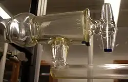 - Un robinet d'arrêt en forme de T dans un assemblage à trois voies, en verre. Deux des sorties se terminent par des adaptateurs de tuyau ordinaires tandis que la troisième se termine par un joint mâle en verre rodé 14/20. Ce robinet est fixé par un ressort métallique facilement démontable.