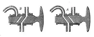 - la voie supérieure de forme droite avec la voie inférieure (figure B à gauche). Une position intermédiaire permet de maintenir le robinet fermé et d'empêcher la circulation de liquide ou de gaz.