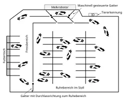 Un petit couloir de contention ou parc de tri avec détecteur d'identité et barrières automatisées, après identification de l'animal, autorise ou refuse son entrée au local de traite en fonction des données enregistrées et de la programmation de l'éleveur (voir schéma d'étable laitière).