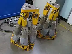 À noter aussi des possibilités d'actionnement très variées : au lieu de jambes rigides, on peut parfaitement utiliser des câbles qui ont permis de réaliser des grues comme la RoboCrane avec une bonne précision de positionnement et 6 degrés de liberté ou bien des supports de maquettes pour les souffleries, comme le projet SACSO (Suspension ACtive pour essais en SOufflerie) de l'Onera.