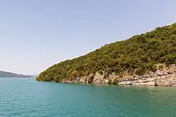 À la base du roc s'ouvrent plusieurs grottes accessibles uniquement en bateau. La plus connue se nomme le Grand Pertuis qui ouvre sur la baie de Talloires. Une vue de l'intérieur a été représentée sur une gravure à l'eau-forte par Albert Besnard[8]. L'artiste a par ailleurs réalisé une étude à l'huile du même sujet (collection particulière).