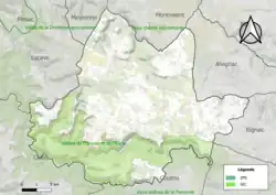 L'occupation des sols de la commune, telle qu'elle ressort de la base de données européenne d’occupation biophysique des sols Corine Land Cover (CLC), est marquée par l'importance des forêts et milieux semi-naturels (56,8 % en 2018), une proportion sensiblement équivalente à celle de 1990 (56,4 %). La répartition détaillée en 2018 est la suivante : milieux à végétation arbustive et/ou herbacée (32,2 %), zones agricoles hétérogènes (28,9 %), forêts (24,6 %), prairies (12,2 %), zones urbanisées (1,6 %), zones industrielles ou commerciales et réseaux de communication (0,5 %)[31]. L'évolution de l’occupation des sols de la commune et de ses infrastructures peut être observée sur les différentes représentations cartographiques du territoire : la carte de Cassini (XVIIIe siècle), la carte d'état-major (1820-1866) et les cartes ou photos aériennes de l'IGN pour la période actuelle (1950 à aujourd'hui)[Carte 1].