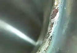 Le rochage se rencontre aussi lors du soudage des aciers inoxydables par procédé TIG ou MIG. Si la protection gazeuse est mal assurée, car il y a nécessité d'inertage à l'envers du cordon de soudure par un gaz inerte comme l'argon, l'inox en fusion s’oxyde avec l'air ambiant, occasionnant le rochage. La soudure interne défectueuse prend un aspect très noir et sa surface cloquée donne l'apparence d'une roche volcanique. Poreuse, elle devient fragile. À l'usage, la zone rochée d'une tôle ou d'une tuyauterie rochée laisse place rapidement à une zone corrodée, sujette au développement bactérien de par sa surface irrégulière.
