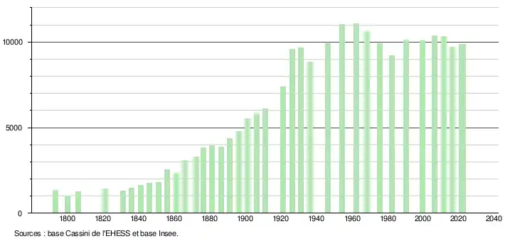 - ↑ Par convention dans Wikipédia, le principe a été retenu de n’afficher dans le tableau des recensements et le graphique, pour les populations de référence postérieures à 1999, que les populations correspondant à une enquête exhaustive de recensement pour les communes de moins de 10 000 habitants, et que les populations des années 2006, 2011, 2016, etc. pour les communes de plus de 10 000 habitants, ainsi que la dernière population de référence publiée par l’Insee pour l'ensemble des communes.
