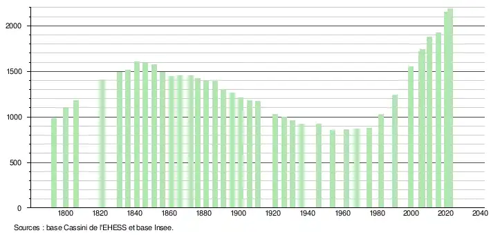 L'évolution du nombre d'habitants est connue à travers les recensements de la population effectués dans la commune depuis 1793. Pour les communes de moins de 10 000 habitants, une enquête de recensement portant sur toute la population est réalisée tous les cinq ans, les populations de référence des années intermédiaires étant quant à elles estimées par interpolation ou extrapolation[21]. Pour la commune, le premier recensement exhaustif entrant dans le cadre du nouveau dispositif a été réalisé en 2005[22].