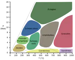 La classification des roches métamorphiques par le biais des faciès métamorphiques utilise l'assemblage minéralogique à l'équilibre des roches étudiées. Chaque faciès métamorphique correspond à un champ de pression – température donné au sein duquel est présent un unique assemblage minéralogique à l'équilibre donné. Les limites entre les différents faciès correspondent à des réactions chimiques par le biais desquelles apparaissent ou disparaissent certains minéraux index. Le nom des faciès est tiré de ceux des roches de la séquence basique (roches de composition basaltique ou gabbroïque)[3].
