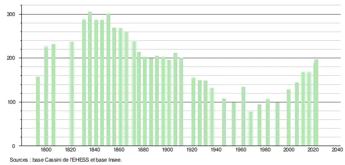L'évolution du nombre d'habitants est connue à travers les recensements de la population effectués dans la commune depuis 1793. Pour les communes de moins de 10 000 habitants, une enquête de recensement portant sur toute la population est réalisée tous les cinq ans, les populations de référence des années intermédiaires étant quant à elles estimées par interpolation ou extrapolation[21]. Pour la commune, le premier recensement exhaustif entrant dans le cadre du nouveau dispositif a été réalisé en 2006[22].