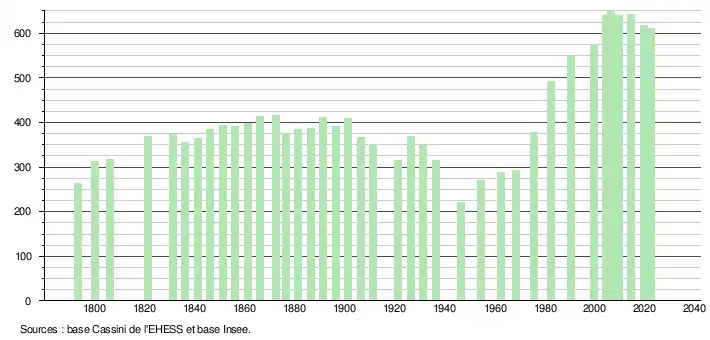 L'évolution du nombre d'habitants est connue à travers les recensements de la population effectués dans la commune depuis 1793. Pour les communes de moins de 10 000 habitants, une enquête de recensement portant sur toute la population est réalisée tous les cinq ans, les populations de référence des années intermédiaires étant quant à elles estimées par interpolation ou extrapolation[16]. Pour la commune, le premier recensement exhaustif entrant dans le cadre du nouveau dispositif a été réalisé en 2004[17].