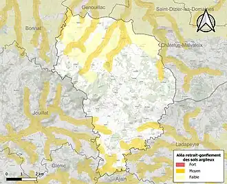 Le retrait-gonflement des sols argileux est susceptible d'engendrer des dommages importants aux bâtiments en cas d’alternance de périodes de sécheresse et de pluie. 19,4 % de la superficie communale est en aléa moyen ou fort (33,6 % au niveau départemental et 48,5 % au niveau national). Sur les 328 bâtiments dénombrés sur la commune en 2019, 35 sont en aléa moyen ou fort, soit 11 %, à comparer aux 25 % au niveau départemental et 54 % au niveau national. Une cartographie de l'exposition du territoire national au retrait gonflement des sols argileux est disponible sur le site du BRGM[15],[Carte 2].