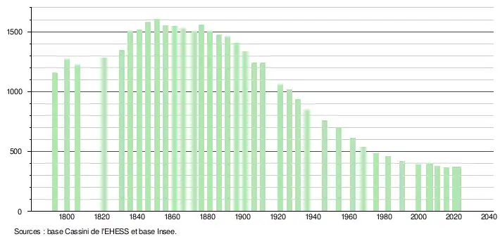 L'évolution du nombre d'habitants est connue à travers les recensements de la population effectués dans la commune depuis 1793. Pour les communes de moins de 10 000 habitants, une enquête de recensement portant sur toute la population est réalisée tous les cinq ans, les populations de référence des années intermédiaires étant quant à elles estimées par interpolation ou extrapolation[18]. Pour la commune, le premier recensement exhaustif entrant dans le cadre du nouveau dispositif a été réalisé en 2005[19].