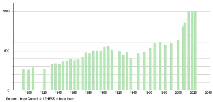 L'évolution du nombre d'habitants est connue à travers les recensements de la population effectués dans la commune depuis 1793. Pour les communes de moins de 10 000 habitants, une enquête de recensement portant sur toute la population est réalisée tous les cinq ans, les populations de référence des années intermédiaires étant quant à elles estimées par interpolation ou extrapolation[34]. Pour la commune, le premier recensement exhaustif entrant dans le cadre du nouveau dispositif a été réalisé en 2008[35].