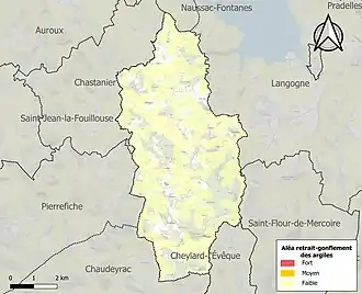 Le retrait-gonflement des sols argileux est susceptible d'engendrer des dommages importants aux bâtiments en cas d’alternance de périodes de sécheresse et de pluie. Aucune partie du territoire de la commune n'est en aléa moyen ou fort (15,8 % au niveau départemental et 48,5 % au niveau national). Sur les 229 bâtiments dénombrés sur la commune en 2019, aucun n'est en aléa moyen ou fort, à comparer aux 14 % au niveau départemental et 54 % au niveau national. Une cartographie de l'exposition du territoire national au retrait gonflement des sols argileux est disponible sur le site du BRGM[17],[Carte 2].
