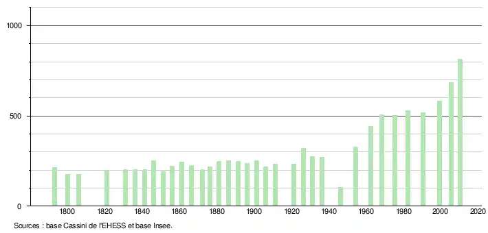 - ↑ Dans le tableau des recensements et le graphique, par convention dans Wikipédia, le principe a été retenu, pour les populations légales postérieures à 1999 de n’afficher dans le tableau des recensements et le graphique que les populations correspondant à l'année 2006, première population légale publiée calculée conformément aux concepts définis dans le décret no 2003-485 du 5 juin 2003, et les années correspondant à une enquête exhaustive de recensement pour les communes de moins de 10 000 habitants, ainsi que la dernière population légale publiée par l’Insee.