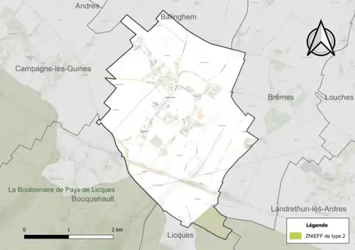 Le territoire communal comprend une ZNIEFF de type 2[Note 2] : la boutonnière de pays de Licques. Cette ZNIEFF, de 17 830 ha, s'étend sur 43 communes[13].