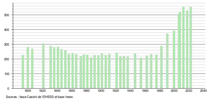 L'évolution du nombre d'habitants est connue à travers les recensements de la population effectués dans la commune depuis 1793. Pour les communes de moins de 10 000 habitants, une enquête de recensement portant sur toute la population est réalisée tous les cinq ans, les populations de référence des années intermédiaires étant quant à elles estimées par interpolation ou extrapolation[29]. Pour la commune, le premier recensement exhaustif entrant dans le cadre du nouveau dispositif a été réalisé en 2007[30].