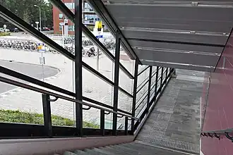 La station dispose de deux accès, de chaque côté des voies. Elle est équipée d'automates pour l'achat et la recharge de titres de transports. Des escaliers, escaliers mécaniques et ascenseurs, pour l'accessibilité des personnes à la mobilité réduite, pour rejoindre la station située au dessus du remblais[4].