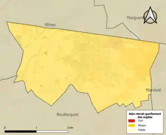 Le retrait-gonflement des sols argileux est susceptible d'engendrer des dommages importants aux bâtiments en cas d’alternance de périodes de sécheresse et de pluie. La totalité de la commune est en aléa moyen ou fort (67,5 % au niveau départemental et 48,5 % au niveau national). Sur les 986 bâtiments dénombrés sur la commune en 2019, 986 sont en aléa moyen ou fort, soit 100 %, à comparer aux 90 % au niveau départemental et 54 % au niveau national. Une cartographie de l'exposition du territoire national au retrait gonflement des sols argileux est disponible sur le site du BRGM[22],[Carte 2].