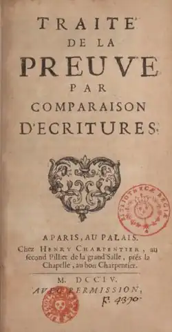 - Traité de la preuve par comparaison d'écritures. Paris : H. Charpentier, 1704. 12°, 152 p. (Paris BNF), consultable sur Gallica.