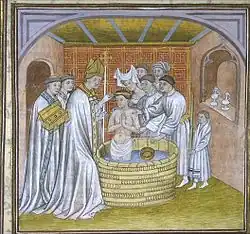 Gui, archevêque de Rouen, traite avec Rollon, chef des Normands. Enluminure du XIVe siècle, Bibliothèque municipale de Toulouse, ms. 512. | |