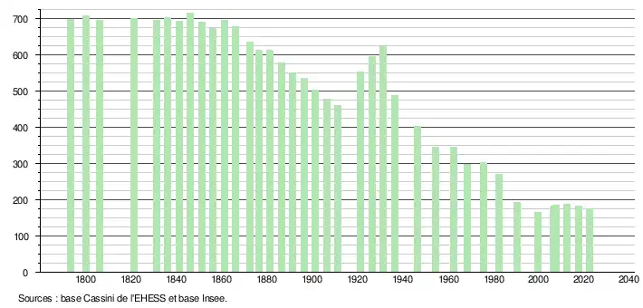 L'évolution du nombre d'habitants est connue à travers les recensements de la population effectués dans la commune depuis 1793. Pour les communes de moins de 10 000 habitants, une enquête de recensement portant sur toute la population est réalisée tous les cinq ans, les populations de référence des années intermédiaires étant quant à elles estimées par interpolation ou extrapolation[17]. Pour la commune, le premier recensement exhaustif entrant dans le cadre du nouveau dispositif a été réalisé en 2007[18].
