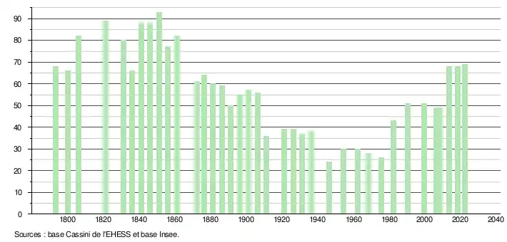 L'évolution du nombre d'habitants est connue à travers les recensements de la population effectués dans la commune depuis 1793. Pour les communes de moins de 10 000 habitants, une enquête de recensement portant sur toute la population est réalisée tous les cinq ans, les populations de référence des années intermédiaires étant quant à elles estimées par interpolation ou extrapolation[17]. Pour la commune, le premier recensement exhaustif entrant dans le cadre du nouveau dispositif a été réalisé en 2008[18].