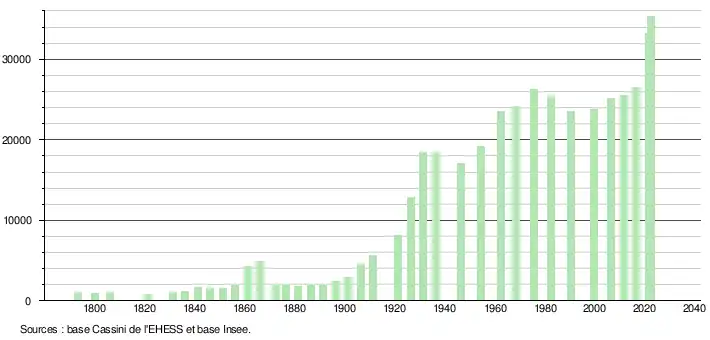 - ↑ Par convention dans Wikipédia, le principe a été retenu de n’afficher dans le tableau des recensements et le graphique, pour les populations de référence postérieures à 1999, que les populations correspondant à une enquête exhaustive de recensement pour les communes de moins de 10 000 habitants, et que les populations des années 2006, 2011, 2016, etc. pour les communes de plus de 10 000 habitants, ainsi que la dernière population de référence publiée par l’Insee pour l'ensemble des communes.