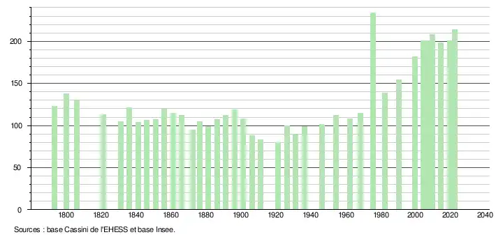 L'évolution du nombre d'habitants est connue à travers les recensements de la population effectués dans la commune depuis 1793. Pour les communes de moins de 10 000 habitants, une enquête de recensement portant sur toute la population est réalisée tous les cinq ans, les populations de référence des années intermédiaires étant quant à elles estimées par interpolation ou extrapolation[13]. Pour la commune, le premier recensement exhaustif entrant dans le cadre du nouveau dispositif a été réalisé en 2004[14].