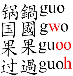 - ↑ Par exemple, il évite d'utiliser alternativement 'y' et 'i', 'w' et 'u', 'wei' et 'ui', 'o' etd 'uo', etc., pratique qui est le fait des systèmes pinyin et Wade-Giles.