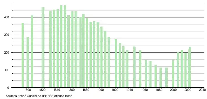 L'évolution du nombre d'habitants est connue à travers les recensements de la population effectués dans la commune depuis 1793. Pour les communes de moins de 10 000 habitants, une enquête de recensement portant sur toute la population est réalisée tous les cinq ans, les populations de référence des années intermédiaires étant quant à elles estimées par interpolation ou extrapolation[18]. Pour la commune, le premier recensement exhaustif entrant dans le cadre du nouveau dispositif a été réalisé en 2006[19].