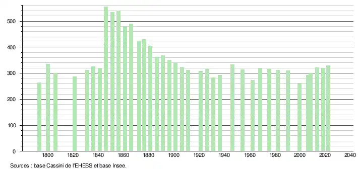 L'évolution du nombre d'habitants est connue à travers les recensements de la population effectués dans la commune depuis 1793. Pour les communes de moins de 10 000 habitants, une enquête de recensement portant sur toute la population est réalisée tous les cinq ans, les populations de référence des années intermédiaires étant quant à elles estimées par interpolation ou extrapolation[26]. Pour la commune, le premier recensement exhaustif entrant dans le cadre du nouveau dispositif a été réalisé en 2008[27].
