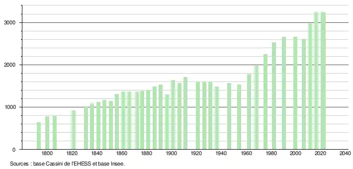 L'évolution du nombre d'habitants est connue à travers les recensements de la population effectués dans la commune depuis 1793. Pour les communes de moins de 10 000 habitants, une enquête de recensement portant sur toute la population est réalisée tous les cinq ans, les populations de référence des années intermédiaires étant quant à elles estimées par interpolation ou extrapolation[31]. Pour la commune, le premier recensement exhaustif entrant dans le cadre du nouveau dispositif a été réalisé en 2006[32].