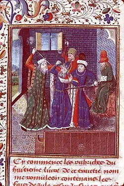 - Niort, Médiathèque Pierre-Moinot, Cote RESG2F (olim MS 25)[17]: Incomplet : il reste 97 folios; le manuscrit commence chapitre 24 du livre II et finit au chapitre 68 du livre VI). Les miniatures ont été détachées[18]. Enluminure attribuée à Pierre Garnier (aussi appelé Préfichault), peintre au service du roi René d'Anjou de 1476 à 1480. Grandes initiales ornées de motifs floraux ou de rinceaux. Don d'Edmond Arnauldet, 1884.