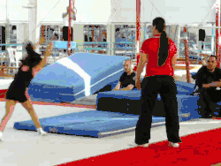 - Un autre quart de rotation, réalisé par le corps, jusqu'à la pose de la deuxième main, les pieds se rejoignant dans cette phase de descente avant l'arrivée au sol.