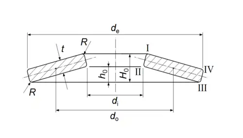 Les principaux paramètres d'une rondelle ressort sont : son diamètre intérieur di, son diamètre extérieur de, son épaisseur t et sa hauteur à vide H0. Dans ces conditions, sa flèche maximale sous charge vaut