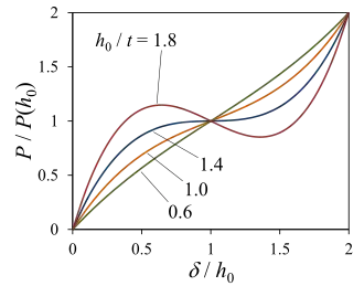 Cependant, il est possible de fabriquer des rondelles ayant des propriétés élastiques très différentes, comme le montrent les courbes charge-flèche ci-contre en fonction du rapport h0/t.