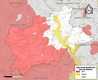 Le retrait-gonflement des sols argileux est susceptible d'engendrer des dommages importants aux bâtiments en cas d’alternance de périodes de sécheresse et de pluie. 66,6 % de la superficie communale est en aléa moyen ou fort (67,4 % au niveau départemental et 48,5 % au niveau national). Sur les 320 bâtiments dénombrés sur la commune en 2019, 180 sont en aléa moyen ou fort, soit 56 %, à comparer aux 81 % au niveau départemental et 54 % au niveau national. Une cartographie de l'exposition du territoire national au retrait gonflement des sols argileux est disponible sur le site du BRGM[24],[Carte 3].