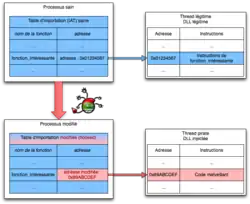 Plusieurs techniques peuvent être utilisées. On peut patcher une bibliothèque, c'est-à-dire lui ajouter du code. On peut aussi détourner l'appel d'un objet – par hooking, (voir infra) –, ce qui revient à appeler une « autre fonction » puis à revenir à la fonction initiale, pour que le détournement soit transparent du point de vue fonctionnel. Enfin, on peut remplacer des appels système par du code malveillant.