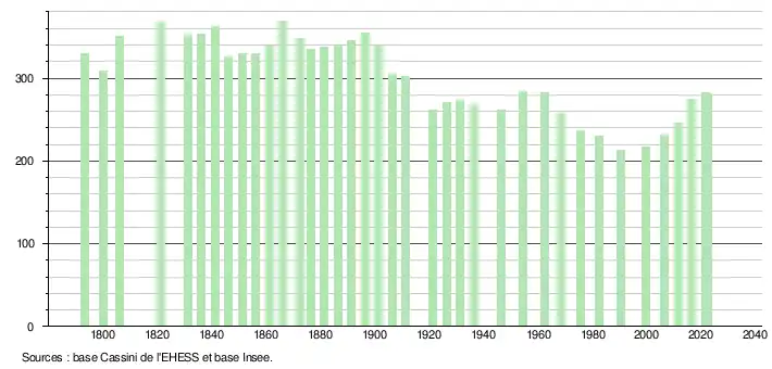 L'évolution du nombre d'habitants est connue à travers les recensements de la population effectués dans la commune depuis 1793. Pour les communes de moins de 10 000 habitants, une enquête de recensement portant sur toute la population est réalisée tous les cinq ans, les populations de référence des années intermédiaires étant quant à elles estimées par interpolation ou extrapolation[21]. Pour la commune, le premier recensement exhaustif entrant dans le cadre du nouveau dispositif a été réalisé en 2006[22].
