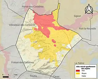 Le retrait-gonflement des sols argileux est susceptible d'engendrer des dommages importants aux bâtiments en cas d’alternance de périodes de sécheresse et de pluie. 52 % de la superficie communale est en aléa moyen ou fort (75,2 % au niveau départemental et 48,5 % au niveau national). Sur les 703 bâtiments dénombrés sur la commune en 2019, 698 sont en aléa moyen ou fort, soit 99 %, à comparer aux 94 % au niveau départemental et 54 % au niveau national. Une cartographie de l'exposition du territoire national au retrait gonflement des sols argileux est disponible sur le site du BRGM[33],[Carte 3].