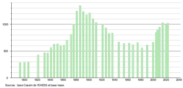 | L'évolution du nombre d'habitants est connue à travers les recensements de la population effectués dans la commune depuis 1793. Pour les communes de moins de 10 000 habitants, une enquête de recensement portant sur toute la population est réalisée tous les cinq ans, les populations de référence des années intermédiaires étant quant à elles estimées par interpolation ou extrapolation[40]. Pour la commune, le premier recensement exhaustif entrant dans le cadre du nouveau dispositif a été réalisé en 2004[41]. En 2022, la commune comptait 1 021 habitants[Note 5], en évolution de −1,92 % par rapport à 2016 (Aude : +2,65 %, France hors Mayotte : +2,11 %). |