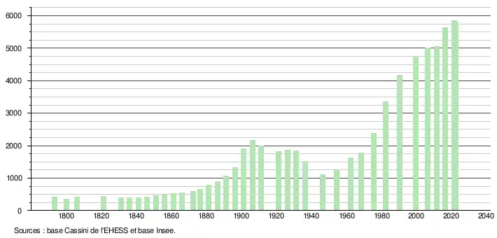 L'évolution du nombre d'habitants est connue à travers les recensements de la population effectués dans la commune depuis 1793. Pour les communes de moins de 10 000 habitants, une enquête de recensement portant sur toute la population est réalisée tous les cinq ans, les populations de référence des années intermédiaires étant quant à elles estimées par interpolation ou extrapolation[22]. Pour la commune, le premier recensement exhaustif entrant dans le cadre du nouveau dispositif a été réalisé en 2006[23].
