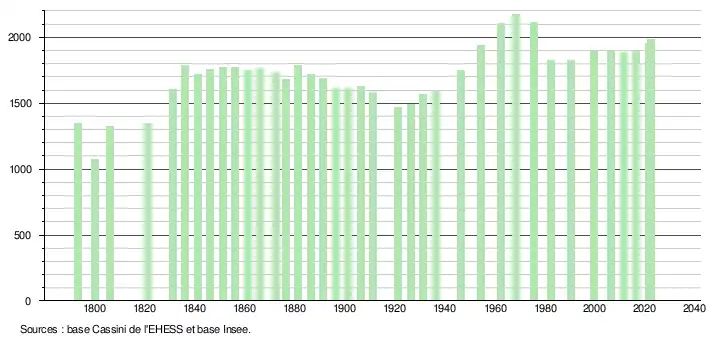 En 2022, la commune comptait 1 987 habitants[Note 7], en évolution de +5,08 % par rapport à 2016 (Landes : +5,78 %, France hors Mayotte : +2,11 %).