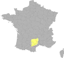 Le décret du définissait une aire très grande : la totalité des départements des Alpes-Maritimes, Aude, Aveyron, Bouches-du-Rhône, Corse-du-Sud, Haute-Corse, Gard, Gers, Gironde, Hérault, Lot-et-Garonne, Lozère, Pyrénées-Atlantiques, Tarn, Tarn-et-Garonne et Var, ainsi qu'une fraction des départements suivants : Alpes-de-Haute-Provence, Dordogne, Haute-Garonne, Landes et Lot[30].